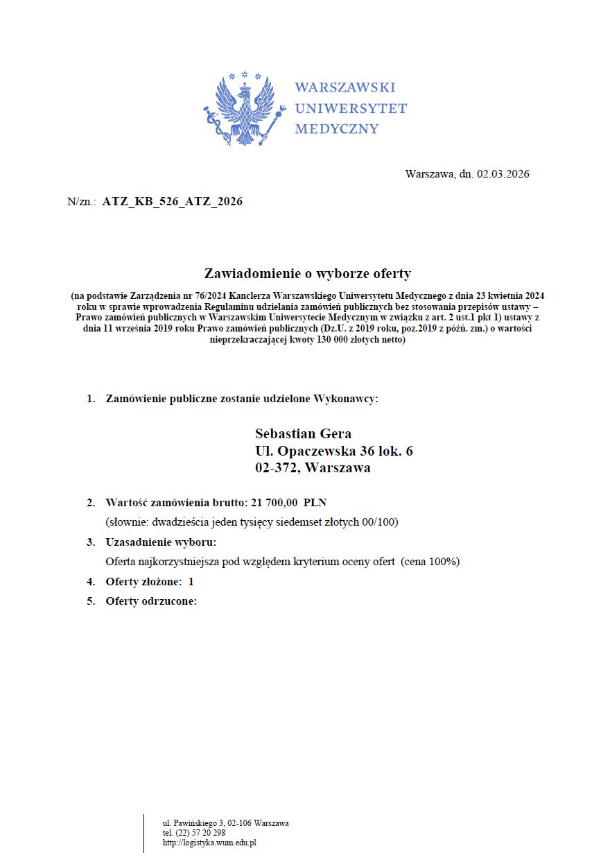 ATZ_MG_1715_WF6_2026 Dostawa specjalistycznych materiałów i akcesoriów laboratoryjnych do analiz wielkości cząstek i potencjału zeta w ramach projektu pn. KPO05 –„Opracowanie nowych systemów terapeutycznych precyzyjnego dostarczania i kontrolowanego uwalniania leków przeciwnowotworowych przeznaczonych do terapii raka trzustki”. |